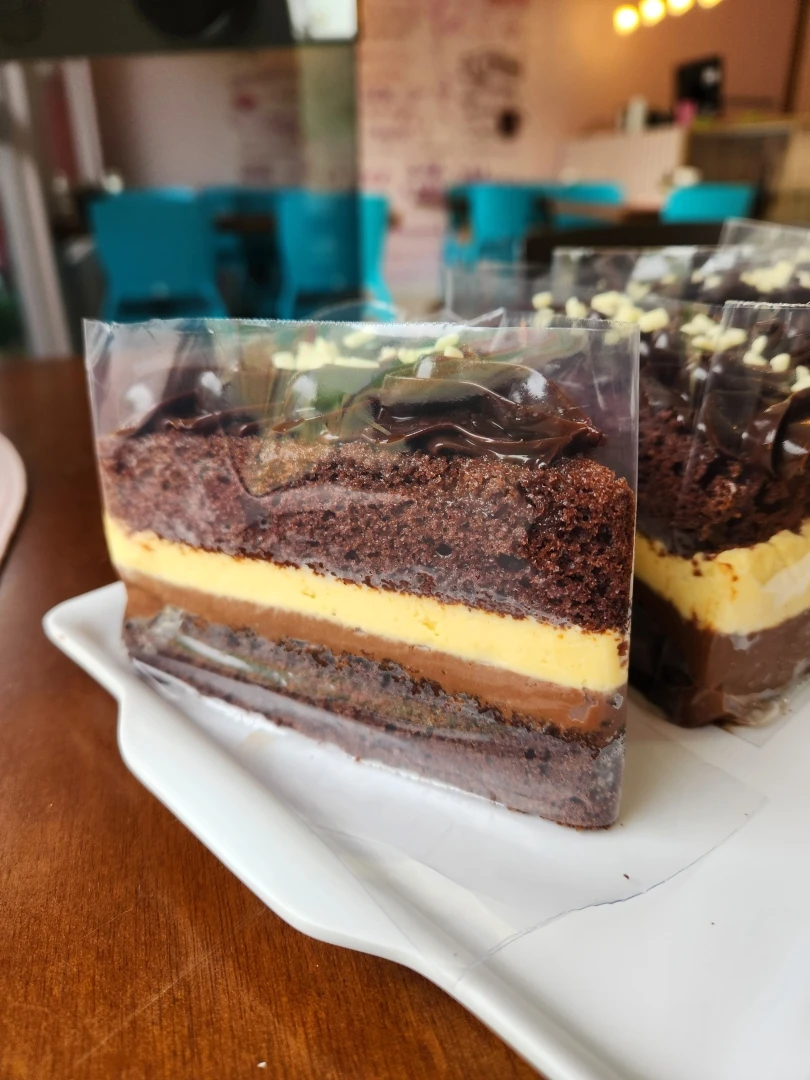 Bolo de chocolate, recheada com ganache de maracujá e chocolate.